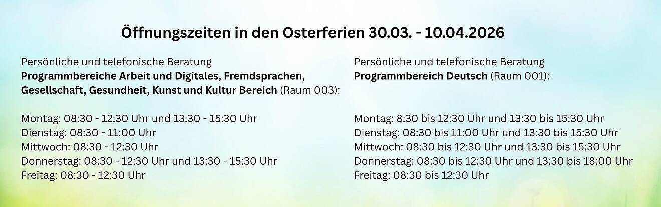 | Kurstitel: Deutsch als Fremdsprache B2/1 (Modul 7, Teil 1): Allgemein und für den Beruf Am Abend | Kursbeginn: Mo., 13.04.2026 | |